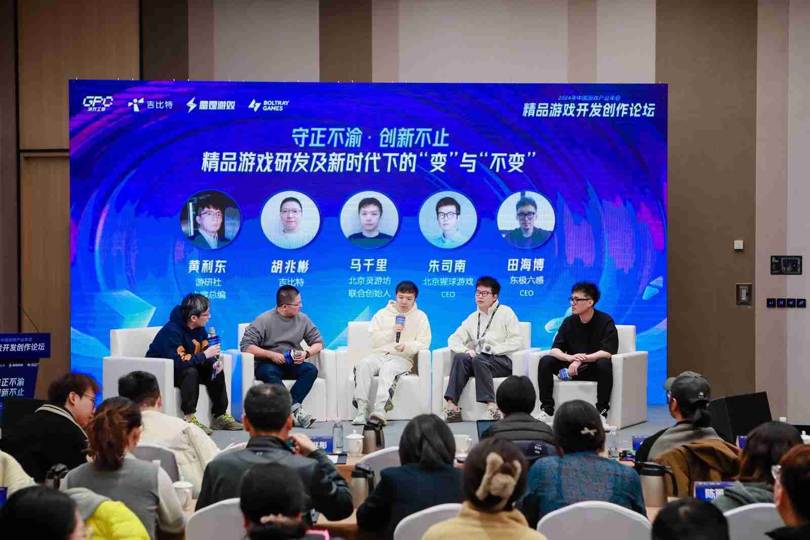 圆桌对话环节,,在游研社内容总编黄利东的主持下,,,35273CTO胡兆彬、、北京灵游坊联合创始人马千里、、、北京猩球游戏CEO朱司南、、东极六感CEO田海博等四位嘉宾围绕“守正不渝、、、、创新不止——精品游戏研发及新时代下的‘变’与‘不变’”这一主题分享了各自在精品游戏开发理念及工程能力搭建方面的见解和经历,,并就行业变化下游戏人需要坚守的理念等展开交流探讨。。。。