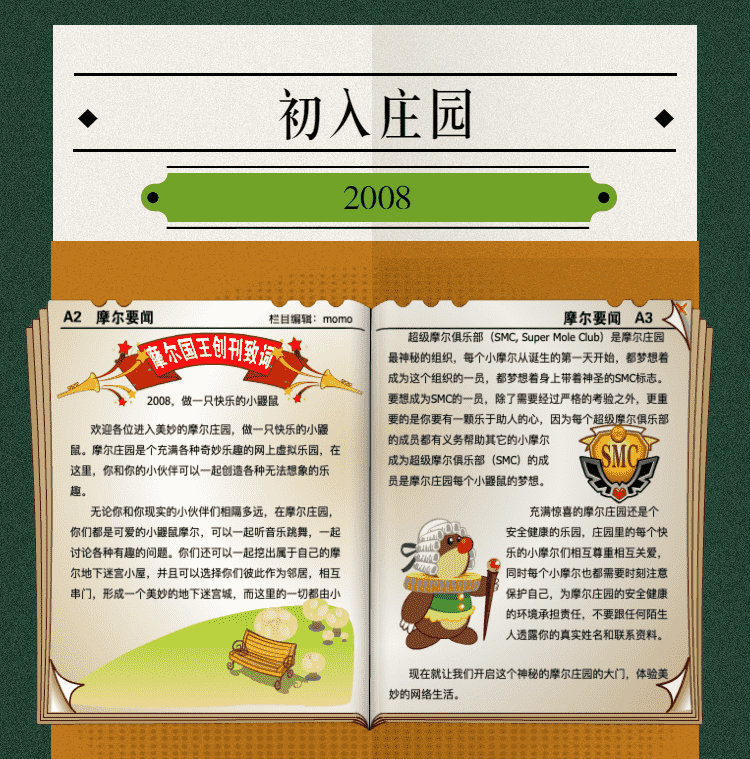 在这一年,,,,摩尔庄园诞生了。。。在这里,,大家都是可爱的红鼻子鼹鼠小摩尔,,可以一起勤劳耕作,,,,一起高山滑雪......我们都是摩尔庄园的建设者。。