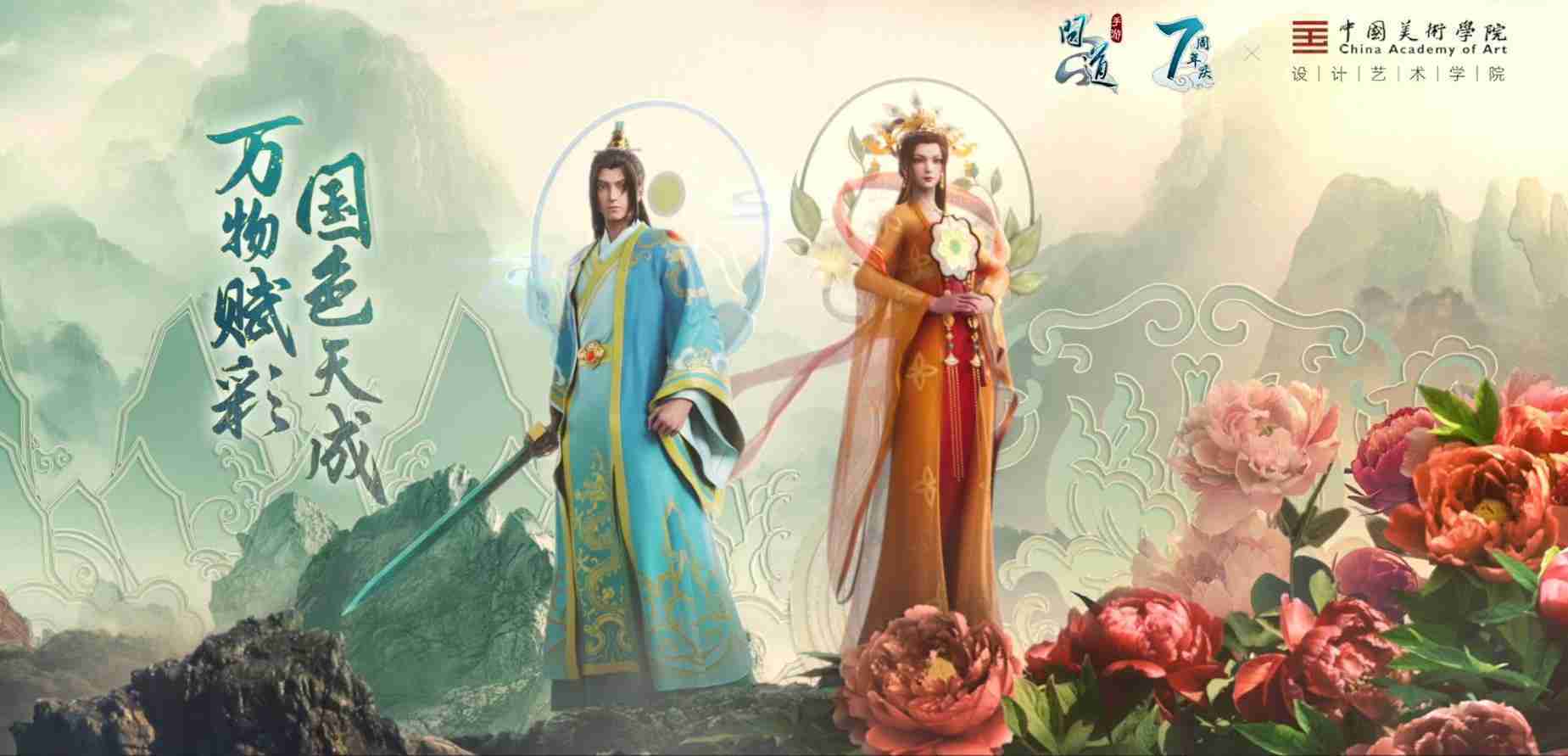 2023年4月,,《问道手游》联动中国美术学院,,,在游戏中融合了中国历史上不同时期的文化元素,,,打造了“山河万象”与“凤鸣九霄”的国风时装。。。。在色彩配置方面,,,,创作团队基于对游戏角色特性的分析提取相应的文化内涵,,,,从每一种色彩的色相、、指代事物和情感出发对应角色属性,,选定服装的色彩搭配。。在纹样设计方面,,,创作团队结合游戏角色自身特殊的造型比例和形态,,,在实际的纹样设计中进行了游戏语境下的活化演绎。。。。男性角色集中使用了如蟒纹、、、、海水江崖纹、、如意纹和云气纹等传统纹样元素,,女性角色则吸纳了凤凰纹、、、牡丹纹、、卷草缠枝纹等元素,,,,组成以“双凤牡丹纹样”“缠枝牡丹纹”“金玉凤冠头饰”为主要纹样的游戏角色装饰图案系统。。。。